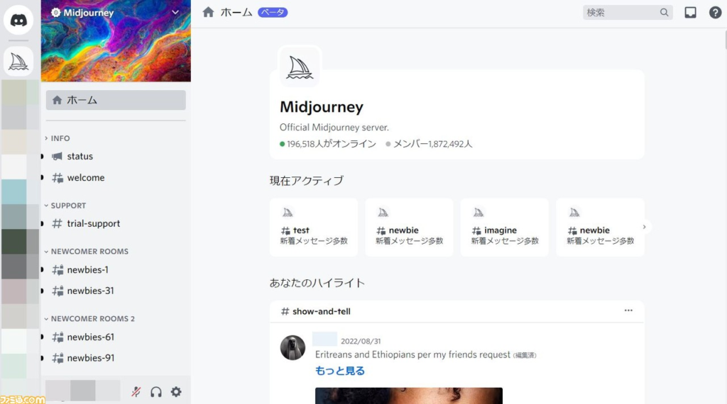 Midjourney自体は公式ホームページのトップ画面から始められるのですが、じつは単体のサービスではなく“Discord(ディスコード)”というフリーウェアのチャットで動くツールになっています。