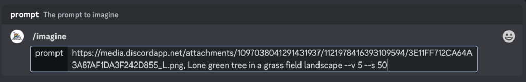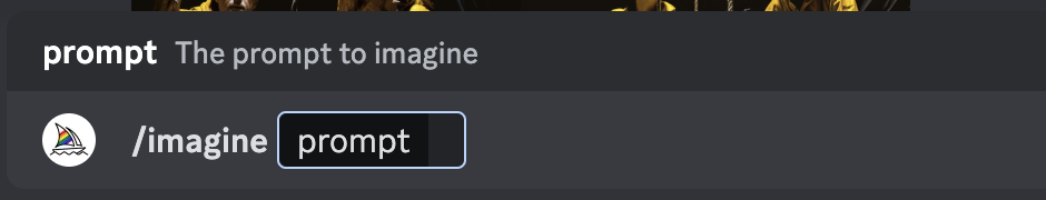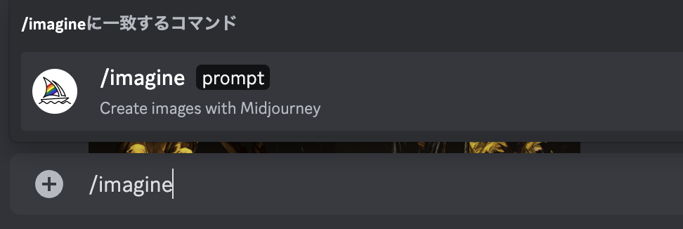 ミッドジャーニーのイメージプロンプトの書き方ですが、まずメッセージボックスのところに “/imagine” と入れたらスペースキーを押す。これで指示文(プロンプト)の入力待ち状態になります。
