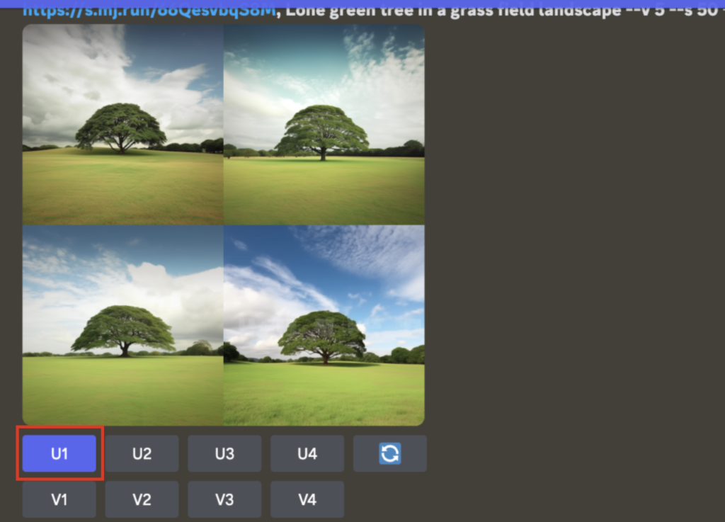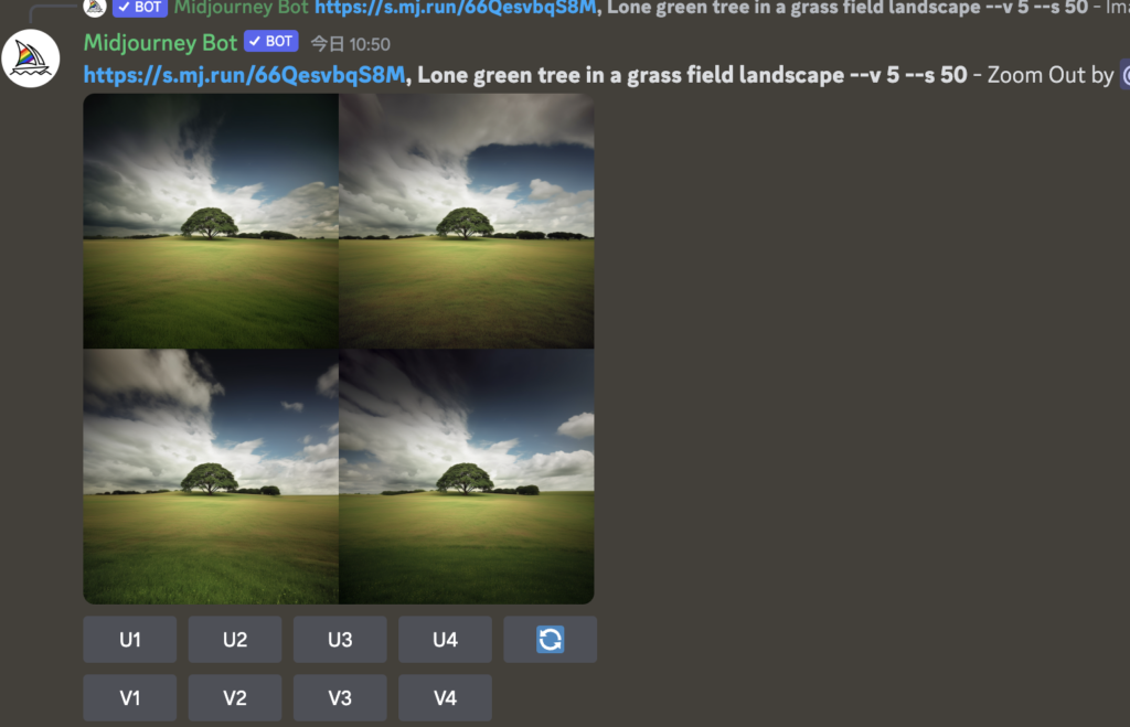 すると、AIがアップした画像と入力した指示文をもとに一度画像を綺麗に作り直してくれます。4パタン提案してくるので、お好きなものをU1〜U4から選択。(V1〜V4はそれぞれ別バージョンを作り直すボタンです。)