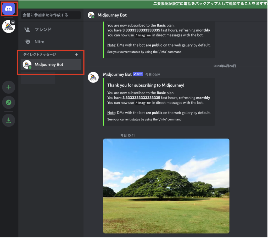 入力したメールアドレスに招待メールが届いたら登録は完了。Midjourneyのトップページから登録(サインイン)していた場合は、DiscordのMidjourneyアカウントとチャンネルが表示されていると思います。