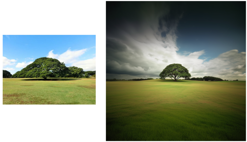 左がオリジナル、右が見切れ範囲を作った画像。ちょっと写真を意識してかレンズ周辺の光量不足まで再現してしまっていますが、指示文で「もっと明るく」などの指示を追加していけば全体が明るい画像も数分でできるでしょう。