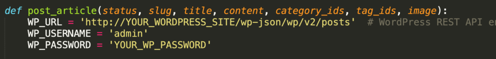 - post.pyのWP_URLに自分のサイトのドメイン、WP_USERNAMEに管理画面ログインユーザー名、WP_PASSWORDに先ほど取得したパスワードを設定してください(雑に作ったので2箇所あります、ごめんなさい)。