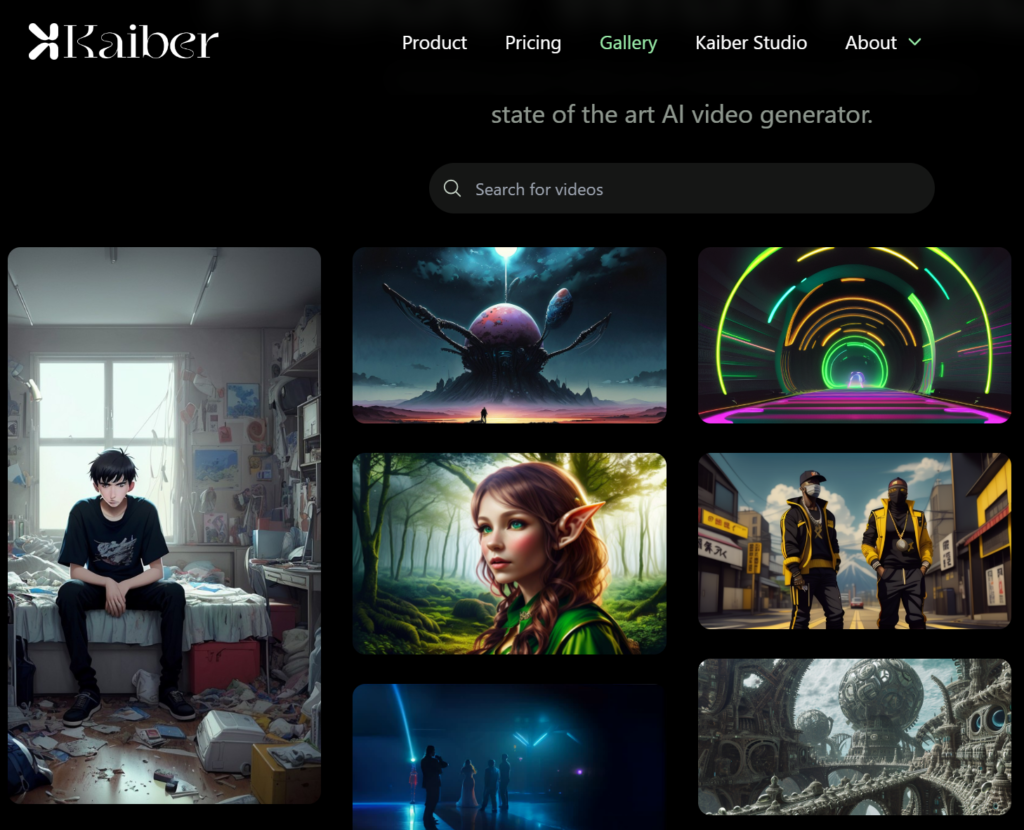 大丈夫。ここでも10分以内に完結する方法があります。kaiber.aiというAI動画生成サイトのギャラリーを見にいってみましょう。